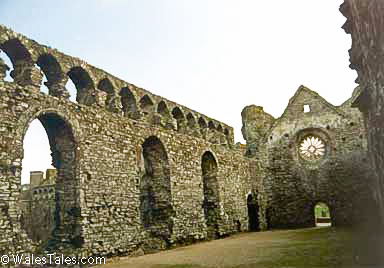 Near the Cathedral is the Bishop’s Palace. Although centuries younger than St. David’s Cathedral, the Palace is a ruin. Its Great Hall, with the roof long gone, sports the fossil of a rosette window. Carved faces, at the bases of roof trusses, have over hundreds of years softened and melted like candy drops. Overhead the sky is blue and a few passing clouds glance in.