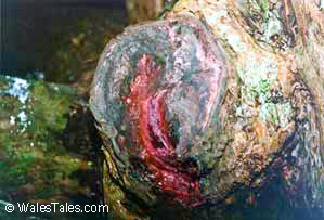 The next part of our tour takes us through Nevern churchyard with its perfect and mysterious 13-foot lichen covered Celtic cross, and its bleeding yew. The tree is positively gushing scarlet sap this morning.